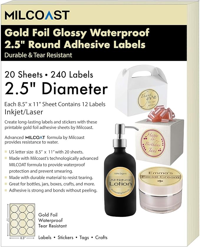 Amazon Com Milcoast Gold Foil Glossy Waterproof Tear Resistant Blank Adhesive 2 5 Round Circle Shaped Labels For Inkjet Laser Printers 240 Labels 20 Sheets Office Products